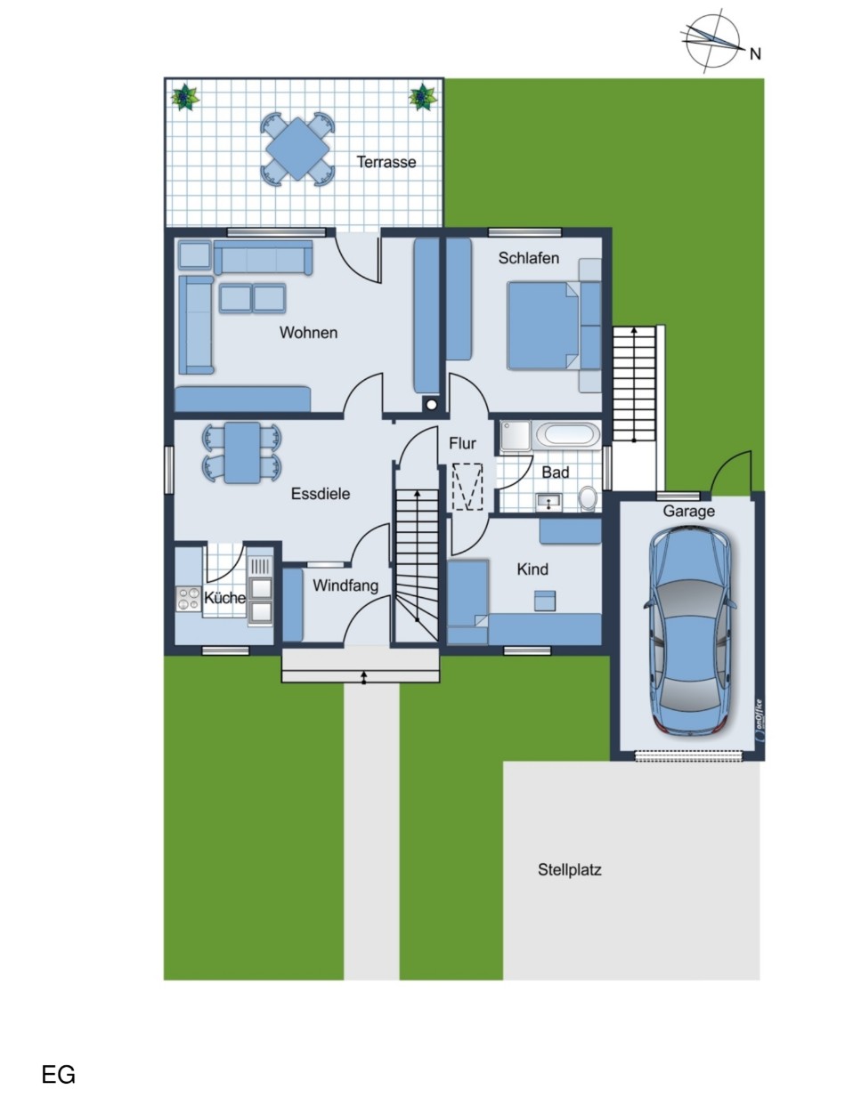 Der helle Wohnbereich bildet das Herzstück des Hauses und öffnet sich zur Terrasse, die zu entspannten Stunden im Freien, geselligen Abenden oder zum Spielen mit der Familie einlädt. Die weiteren Zimmer lassen sich flexibel als Schlaf-, Kinder-, Arbeits- oder Gästezimmer gestalten und bieten ausreichend Platz für individuelle Lebensentwürfe.