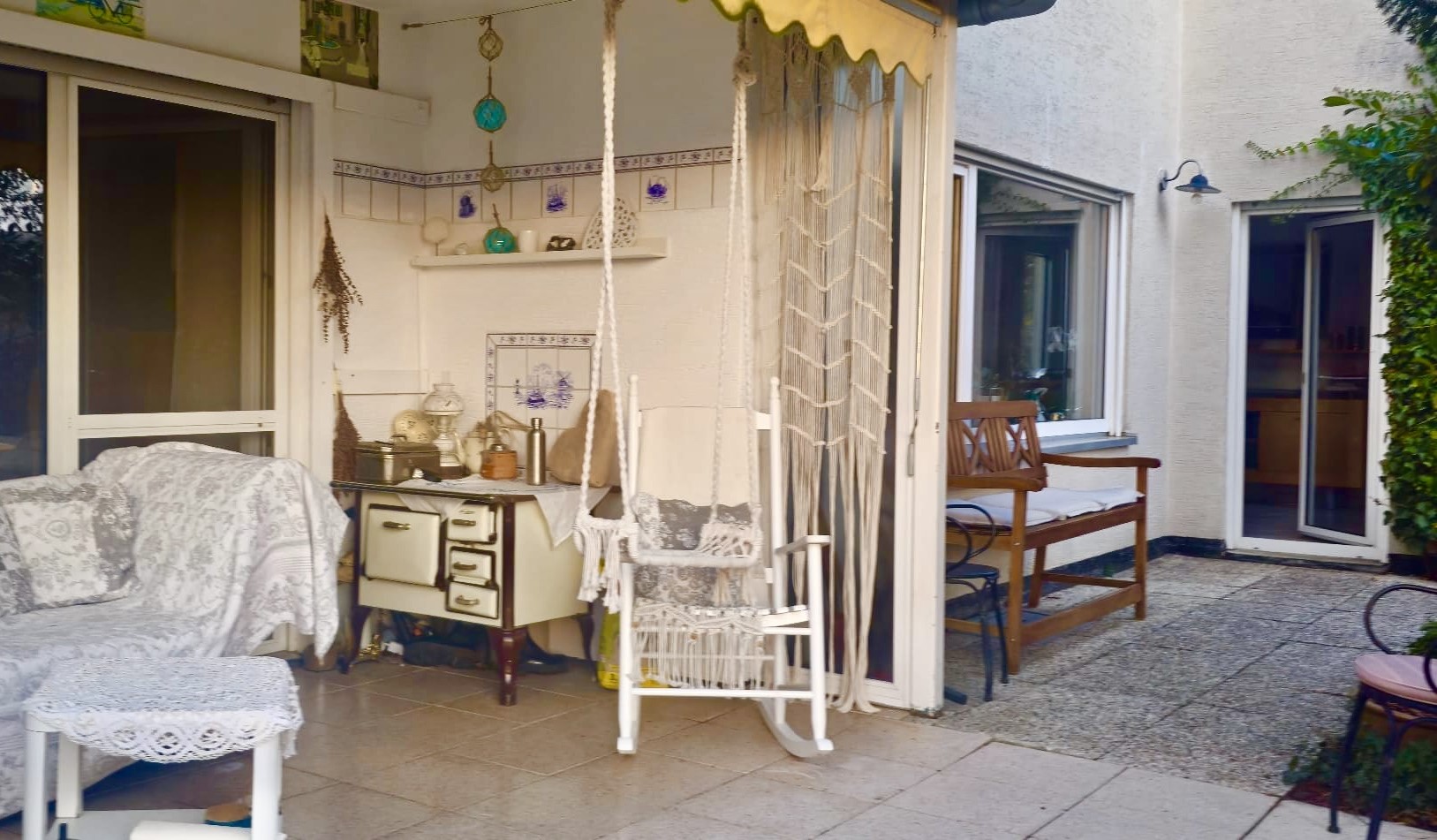 Die gemütlichen Terrassenbereiche sind vor neugierigen Blicken geschützt und laden zum Verweilen und Entspannen ein. Die zweite überdachte Terrasse ist von einem der zwei Schlafzimmer begehbar, hier genießen Sie u. a. wundervolle Sonnenuntergänge und verbringen Ihre schönsten Freizeitstunden. Dieser besondere Outdoorbereich empfängt Sie als erweiteter Wohnraum im angesagten Boho-Stil. Warme Naturmaterialien und üppige Topfpflanzen prägen das jetzige liebevolle Erscheinungsbild, während luftige, helle Stoffe sanft im Wind schwingen und eine entspannte, beinahe mediterrane Atmosphäre schaffen. Dieser vor der Witterung weitestgehend geschützte Ort ist nahezu ganzjährig nutzbar, sei es für ruhige Stunden mit einem guten Buch, für gesellige Abende mit Freunden oder stilvolle Dinner im Freien.