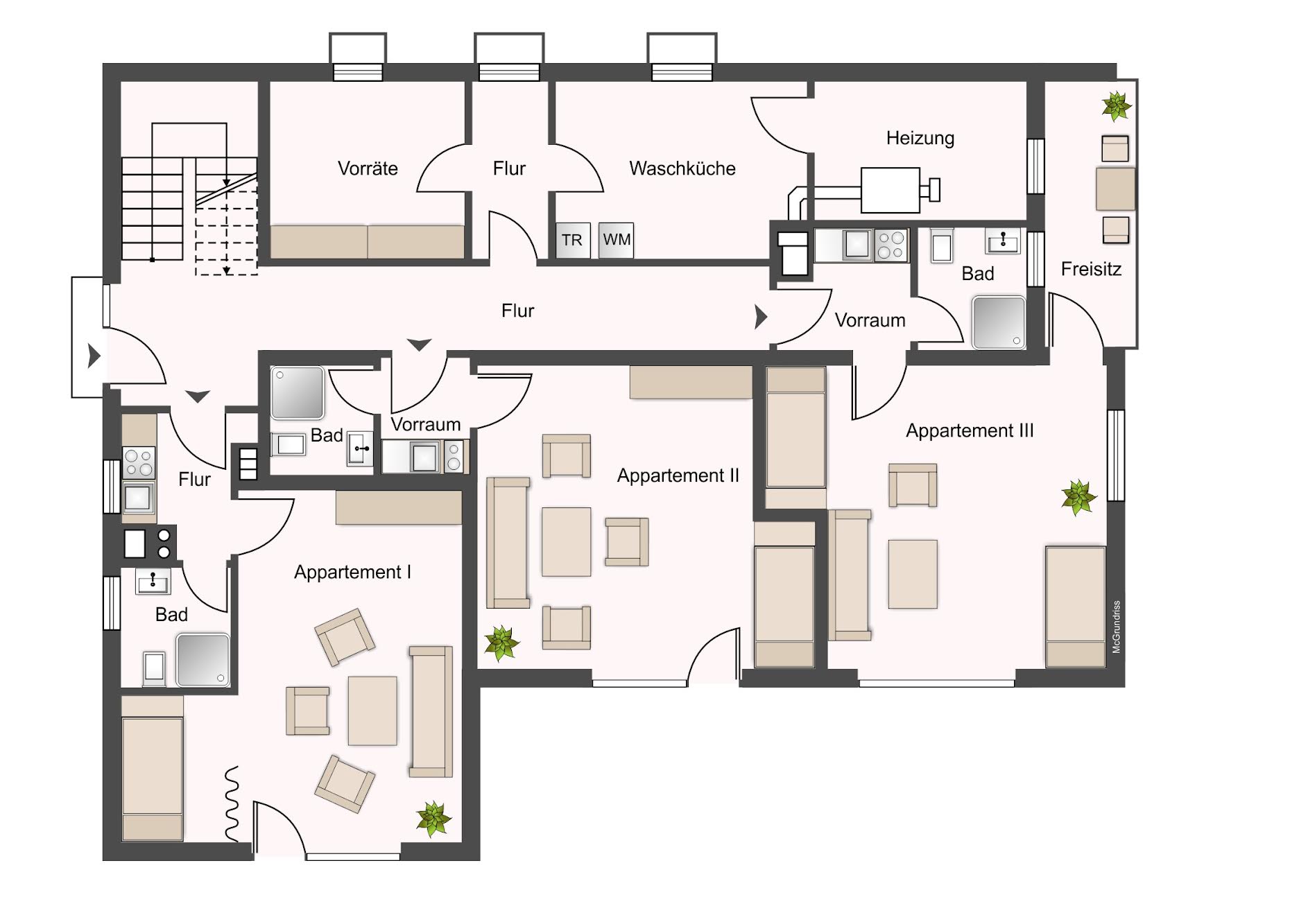 Im Objekt befinden sich 5 voneinander getrennte Wohneinheiten. Drei kleinere Appartements (im Sockelgeschoss gelegen) sind dauerhaft vermietet.